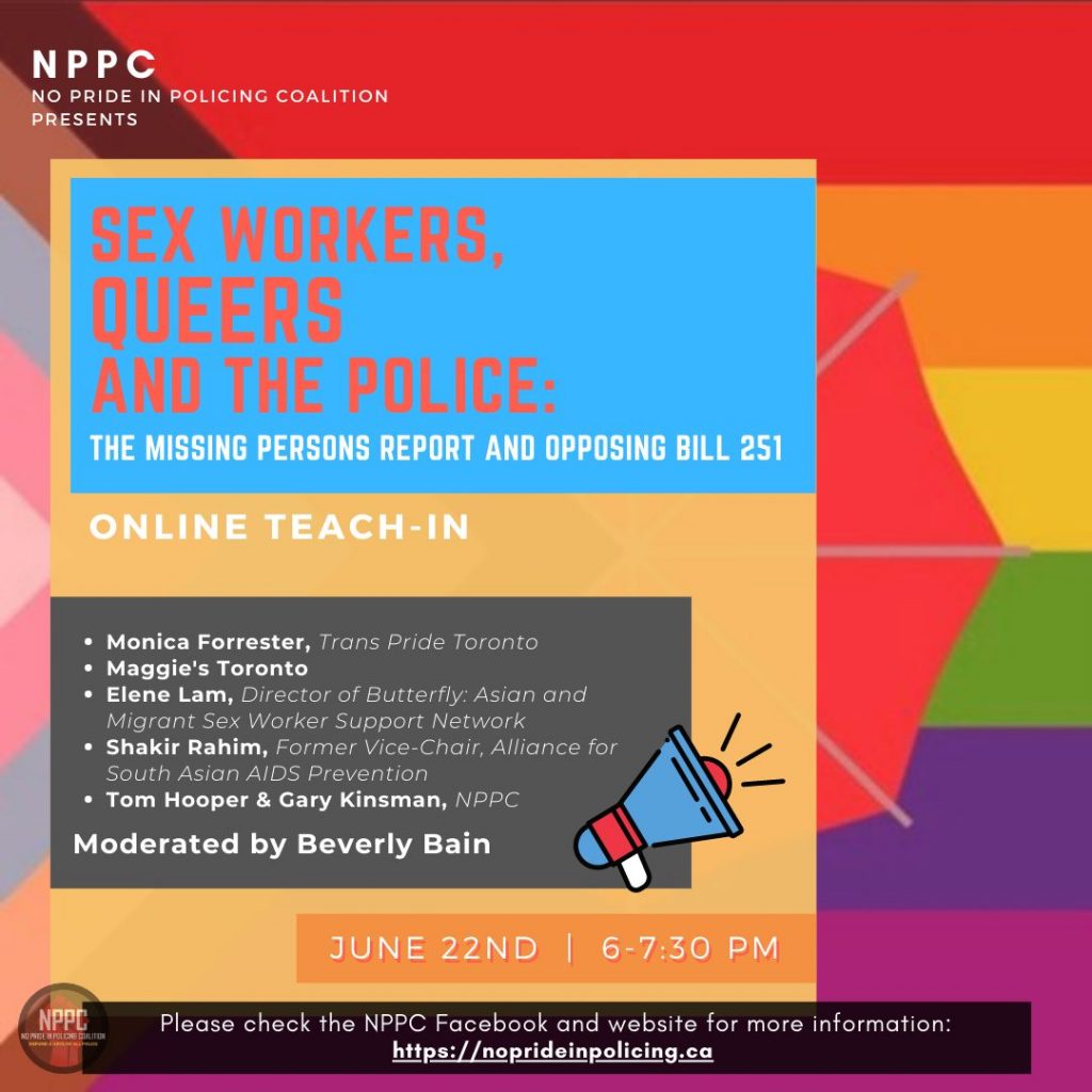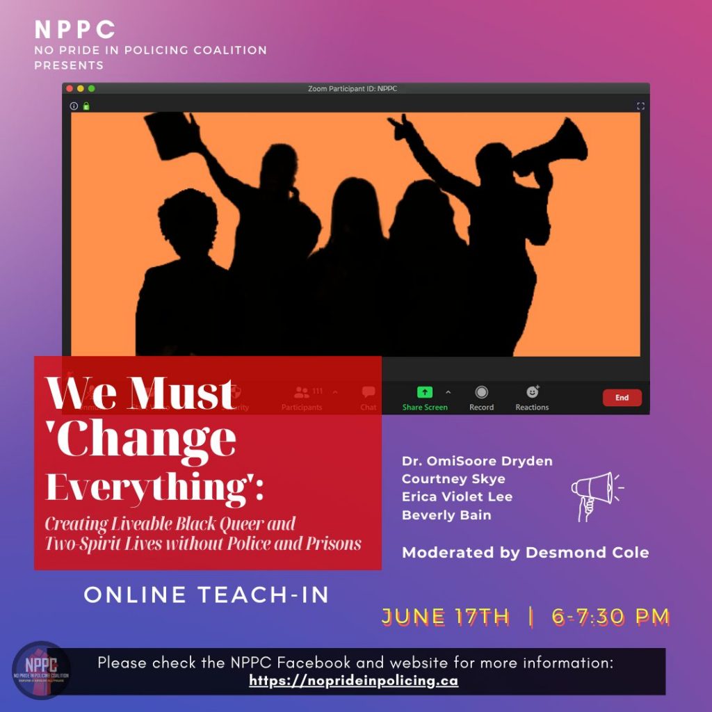 The No Pride in Policing Coalition (NPPC) is an antiracist queer and trans group formed to support Black Lives Matter – Toronto and is focused on defunding and abolishing the police. We initiated the Pride Day 2020 Defund and Abolish All Police rally and teach-in of close to 3,000 people held at Nathan Philips Square, June 28, 2020 and the 600 person rally for defunding and abolishing the Toronto police held outside Toronto Police HQ on July 16, 2020.